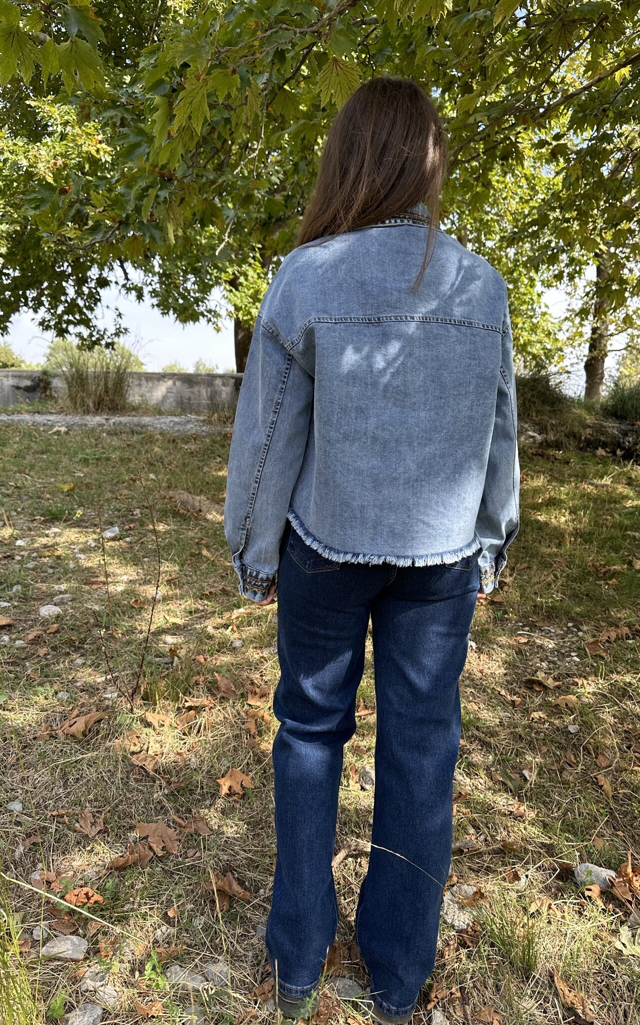 Τζιν τζάκετ με γιακά, κουμπιά σε όλο το μήκος, σχέδιο κέντημα και ξέφτια στο τελείωμα!