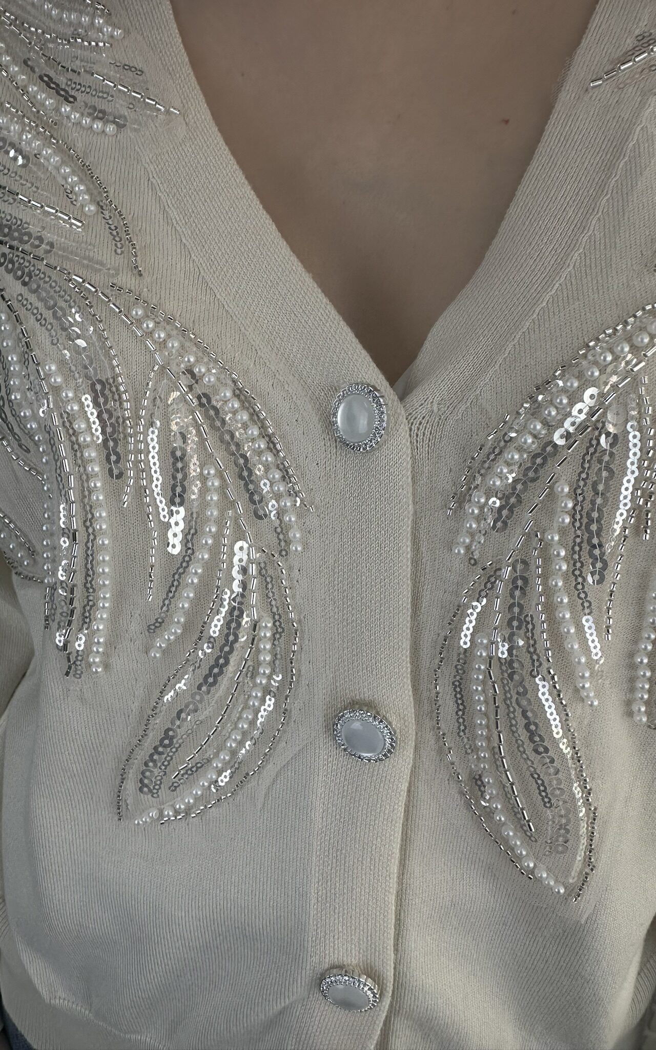 Ζακέτα Πλεκτή Με Σχέδιο Από Παγιέτες και Χάντρες – Κρέμ
