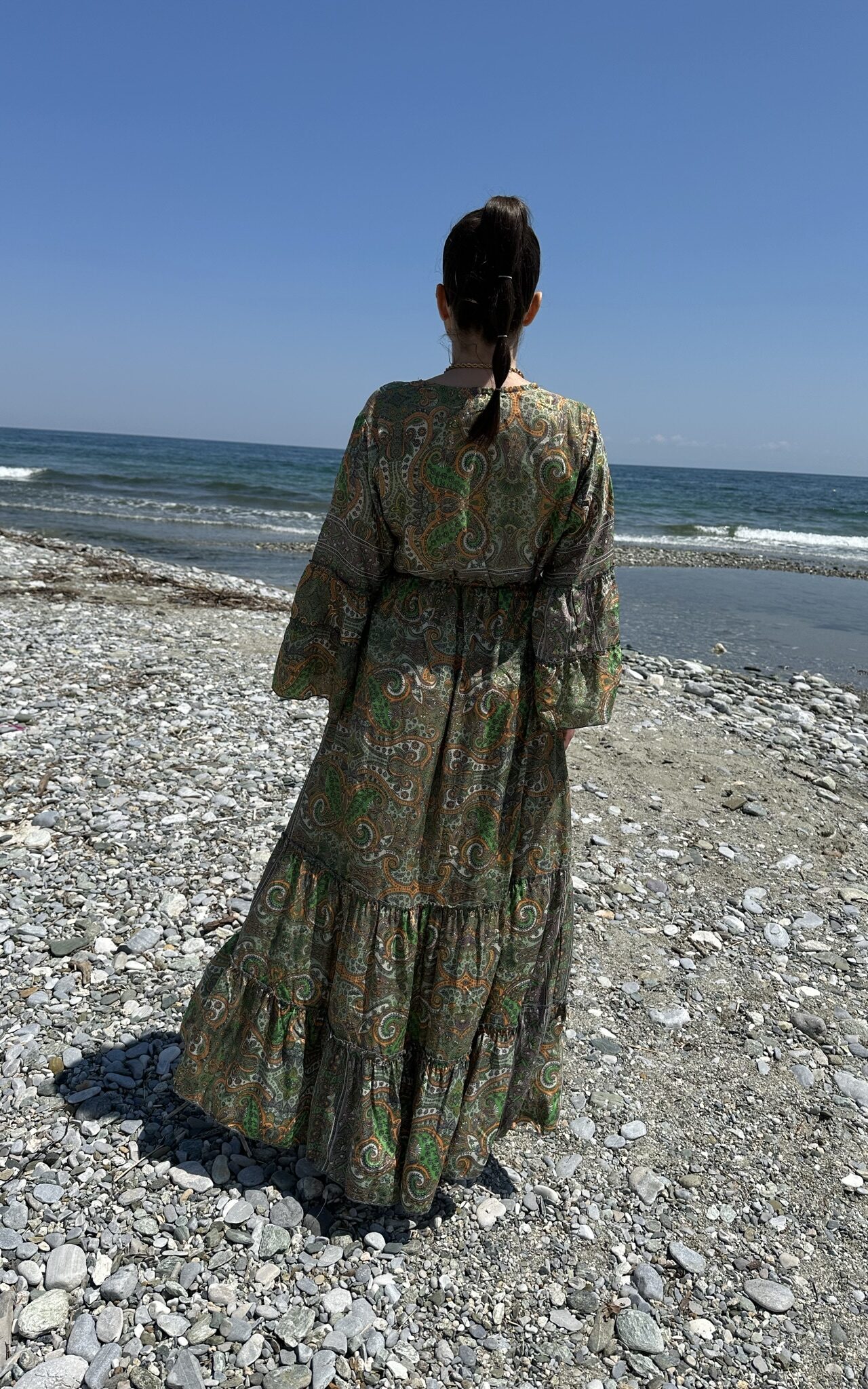 Βοho φόρεμα με βολάν μανίκια, λάστιχο στην μέση και βολάν στο τελείωμα.