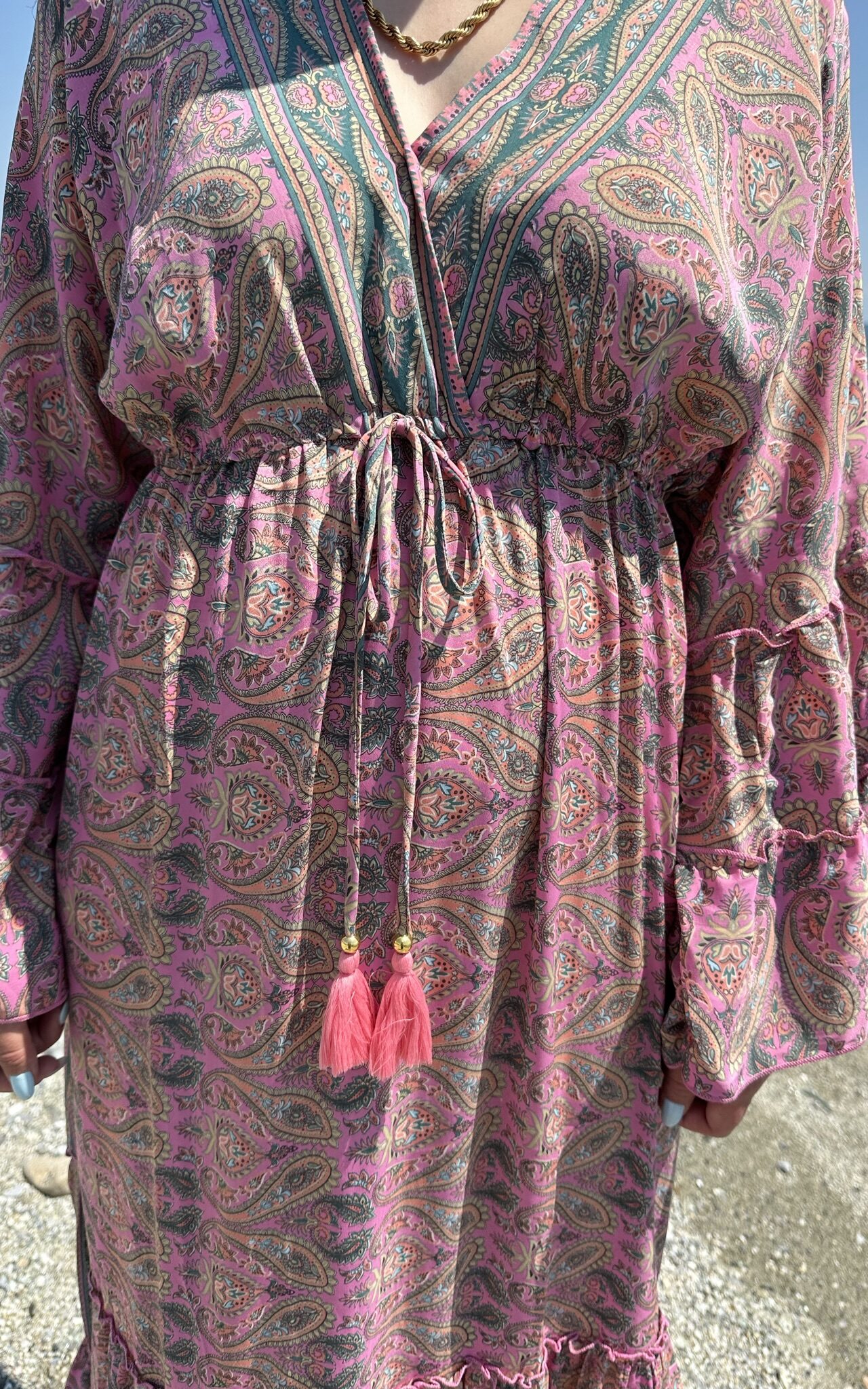 Βοho φόρεμα με βολάν μανίκια, λάστιχο στην μέση και βολάν στο τελείωμα.